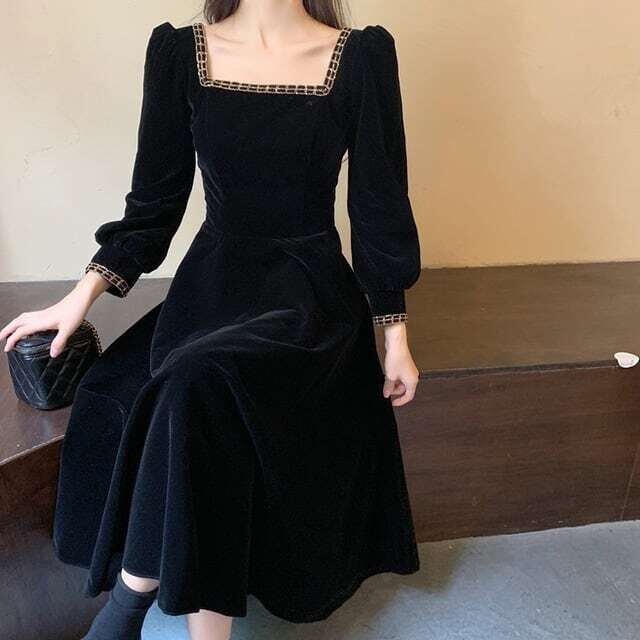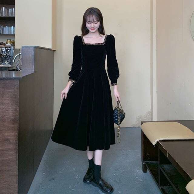 スクエアネックワンピース Aラインスカート レトロ ガーリー E496
