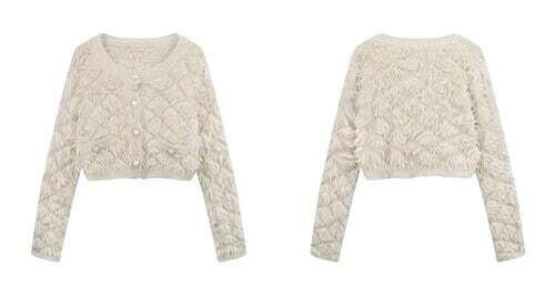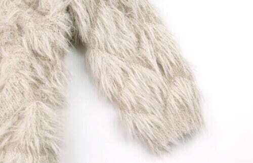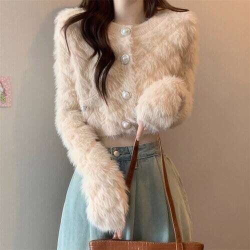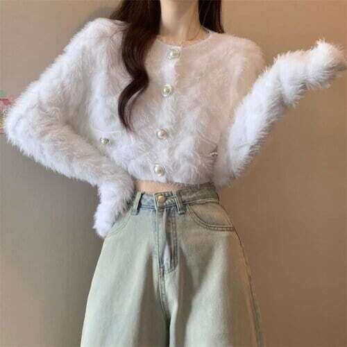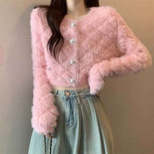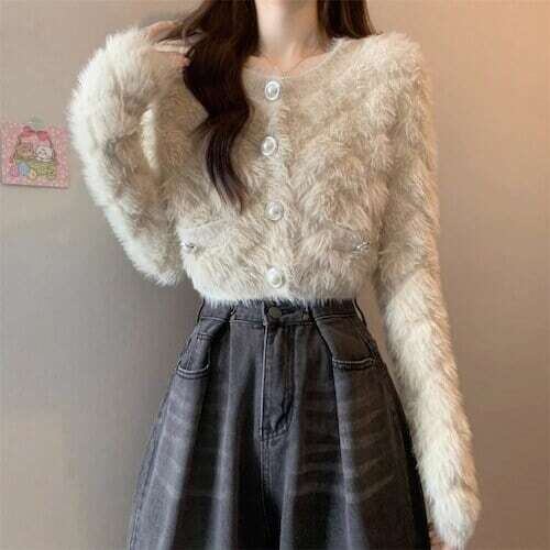 シャギーニット カーディガン ショート丈 ビッグボタン フェミニン E554