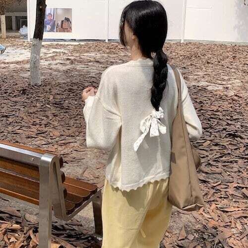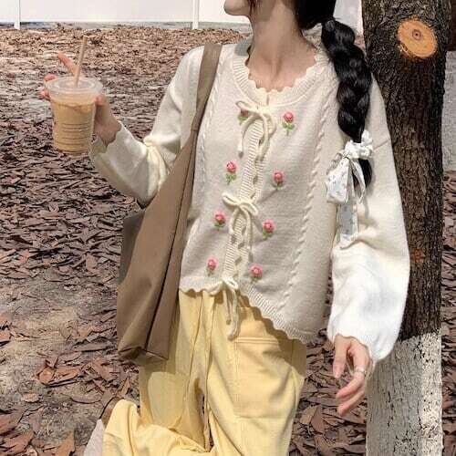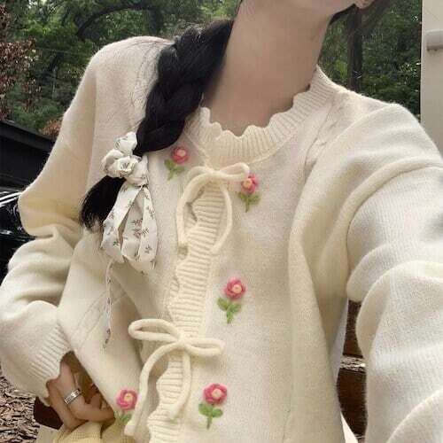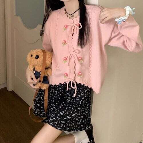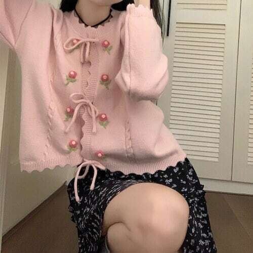 ニットカーディガン 花柄刺繍 リボンボタン フェミニン ガーリー E558