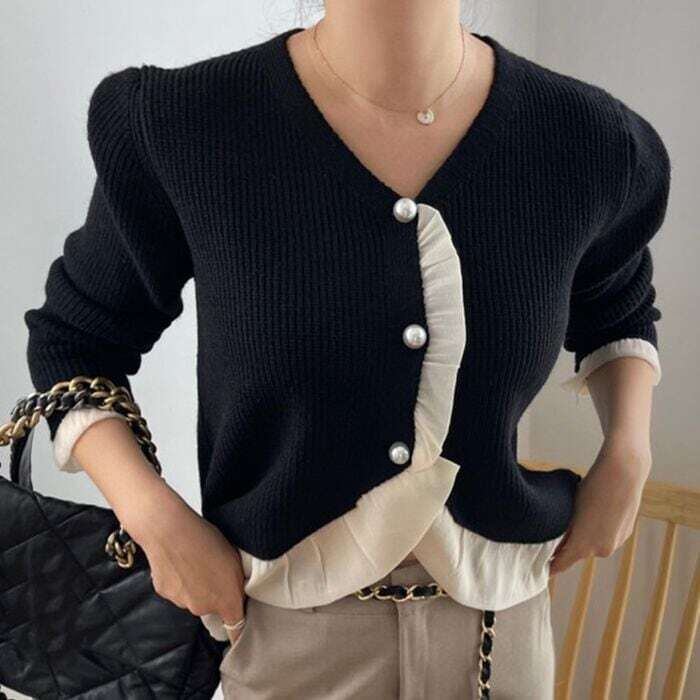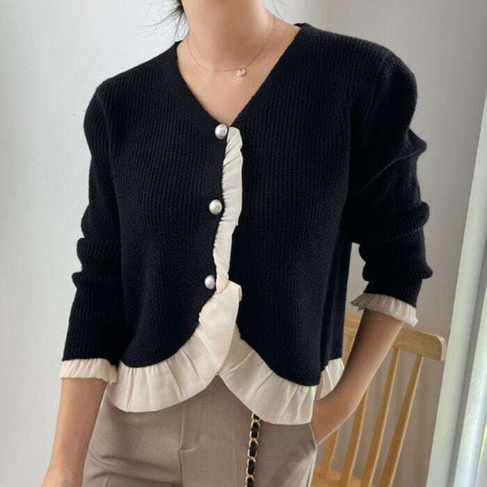 デザインカーディガン フリルカーディガン バイカラー ガーリー カジュアル E137