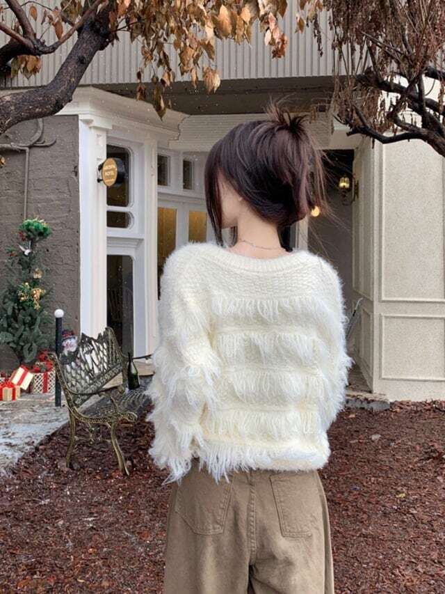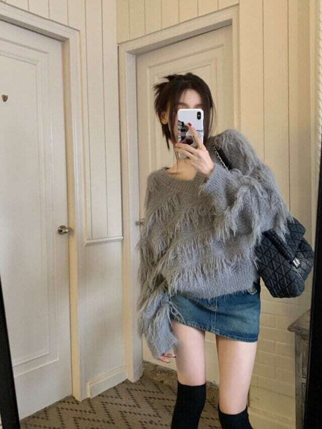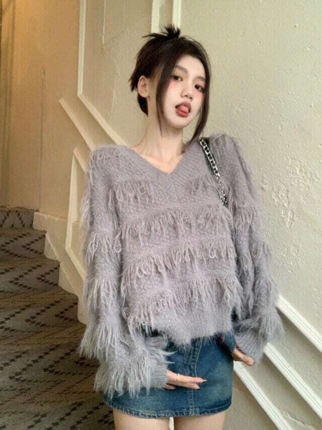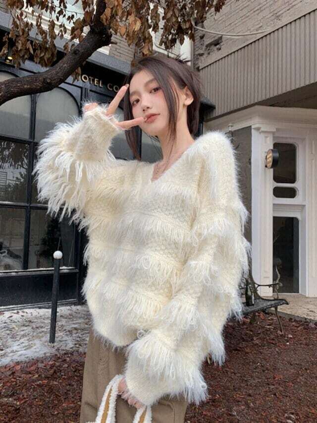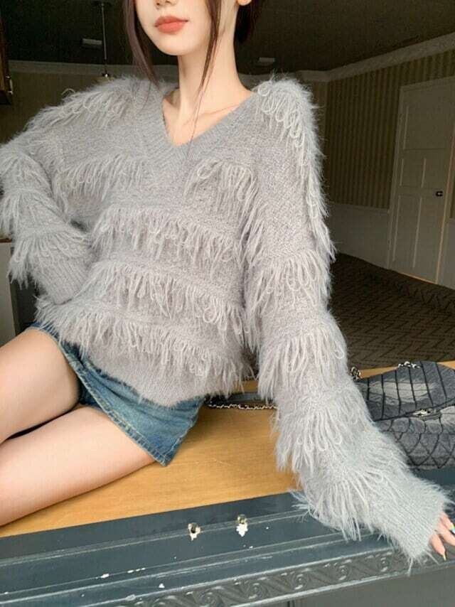 フリンジニット Vネックセーター カジュアル ガーリー E526