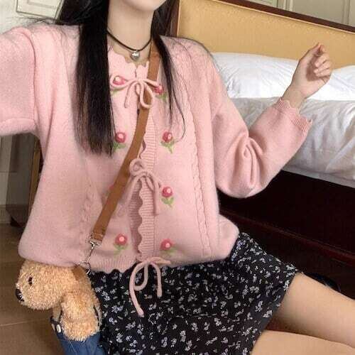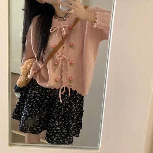 ニットカーディガン 花柄刺繍 リボンボタン フェミニン ガーリー E558