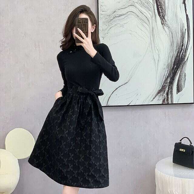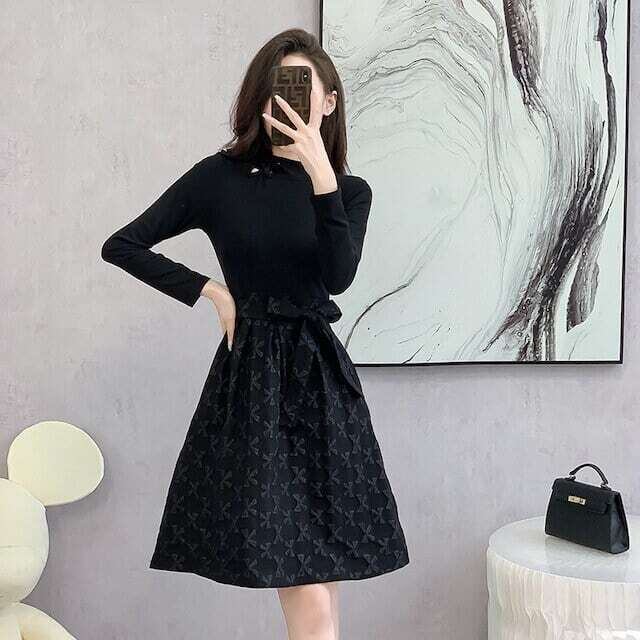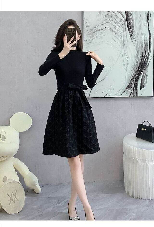 リボン柄ワンピース ウエストリボン レトロ ガーリー お呼ばれ E545