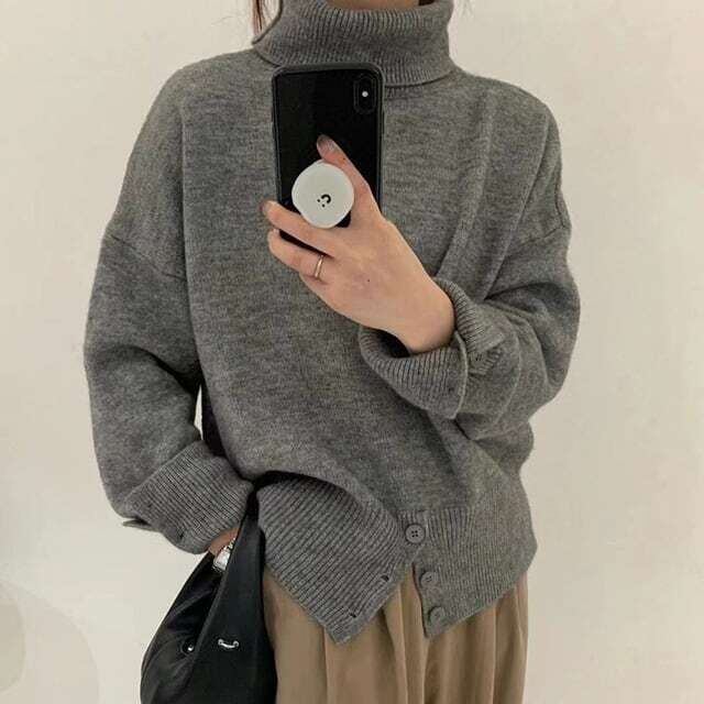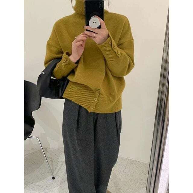 タートルネックセーター ボタンモチーフ ハイネック カジュアル E718
